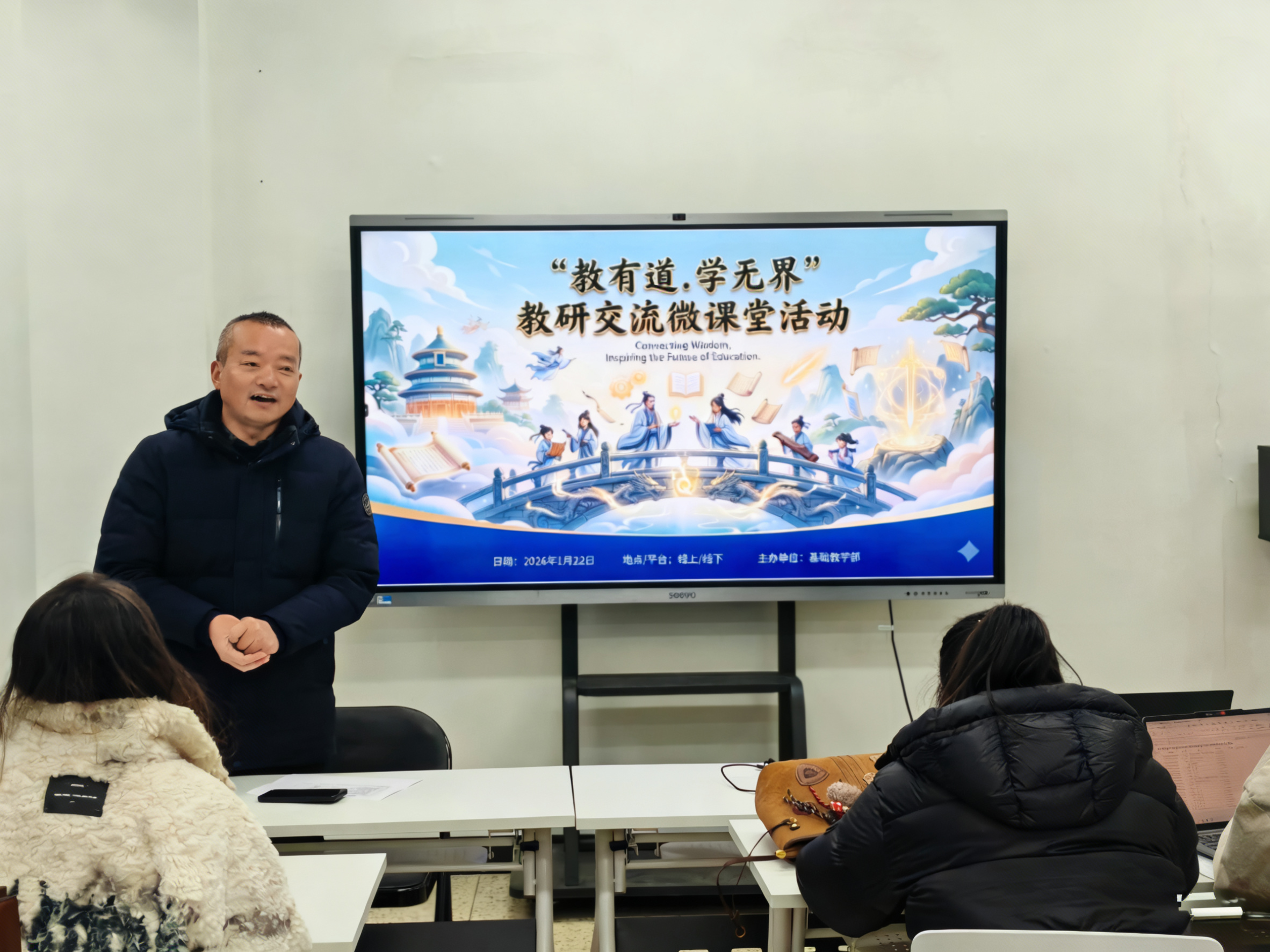 为积极响应学校“教学质量提升年”号召,深入推动“新双高”建设,主动融入人工智能时代教育变革浪潮,基础教学部于2026年1月22日下午,在部门会议室成功举办首期“教有道·学无界”教研交流微课堂活动。本次活动由基础教学部党总支书记郑洪成主持,全体专任教师积极参与,共同聚焦“教有道·学无界”主题,探索智慧教育新形态。